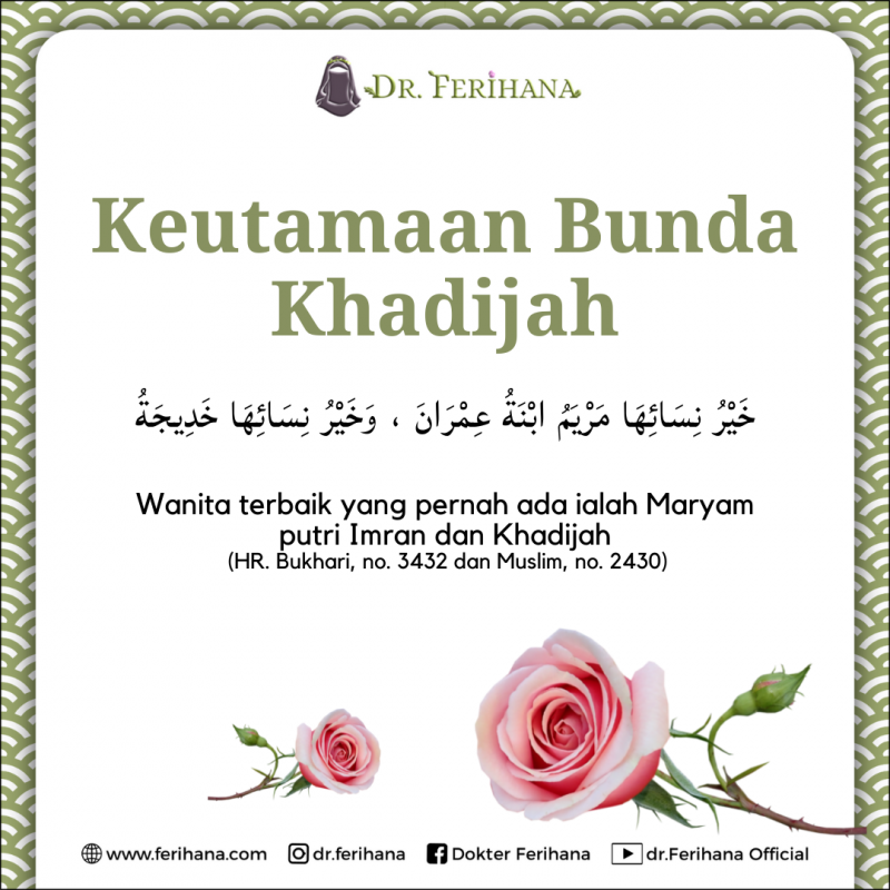 Keutamaan Bunda Khadijah Wanita terbaik Mendapatkan salam dari Allah Perhatikanlah bagaimana beliau berjalan jauh demi mengantarkan makanan untuk Rasulullah. Sungguh, beliaulah teladan bagi seorang muslimah terutama bagaimana bersikap saat menjadi seorang istri Dari ‘Ali radhiyallahu ‘anhu, Nabi shallallahu ‘alaihi wa sallam bersabda, خَيْرُ نِسَائِهَا مَرْيَمُ ابْنَةُ عِمْرَانَ ، وَخَيْرُ نِسَائِهَا خَدِيجَةُ Wanita terbaik yang pernah ada ialah Maryam […]